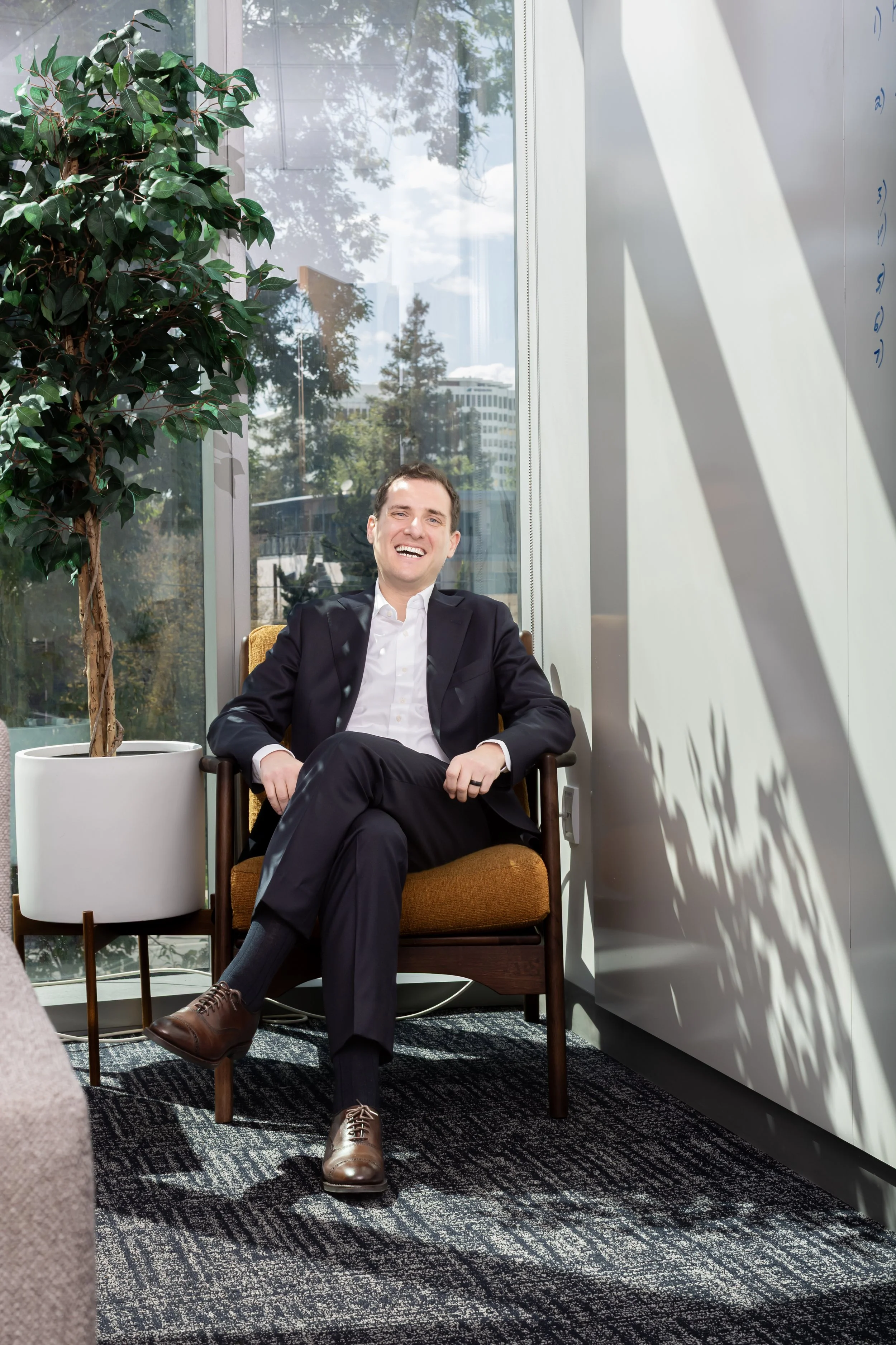 A man in a business suit sitting on a yellow armchair in an office or lounge area, smiling and relaxed, with large windows showing trees and buildings outside, and a whiteboard on the right side.