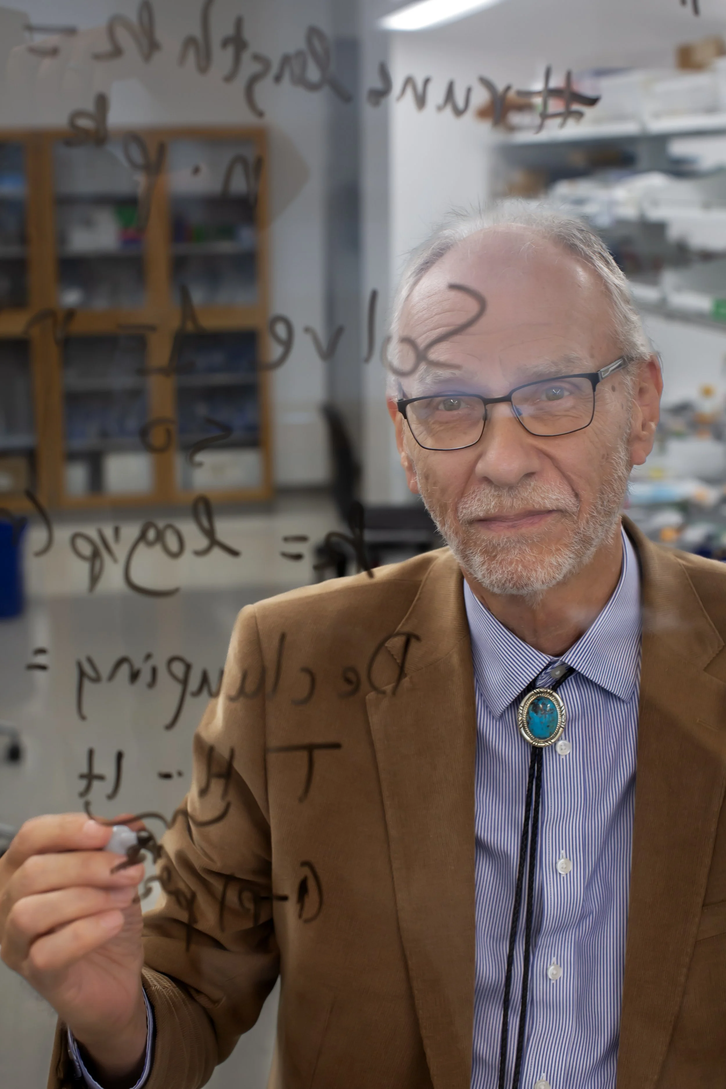 An elderly man with gray hair and a beard, wearing glasses, a brown blazer, and a bolo tie with a turquoise stone, writing mathematical equations on a glass board in a laboratory or office setting.