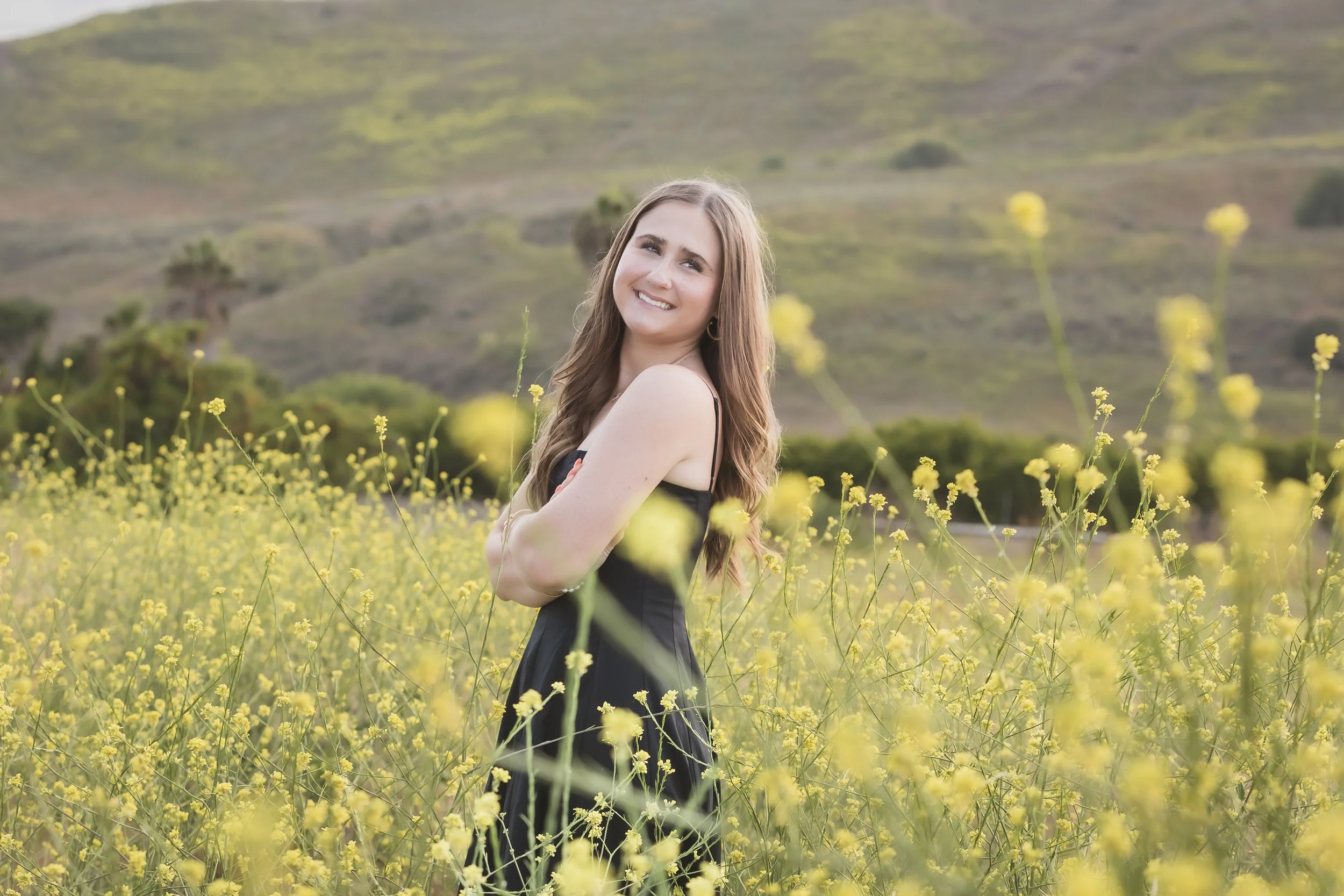 A young woman with long brown hair wearing a black dress smiling and posing in a field of yellow wildflowers with a hilly landscape in the background.