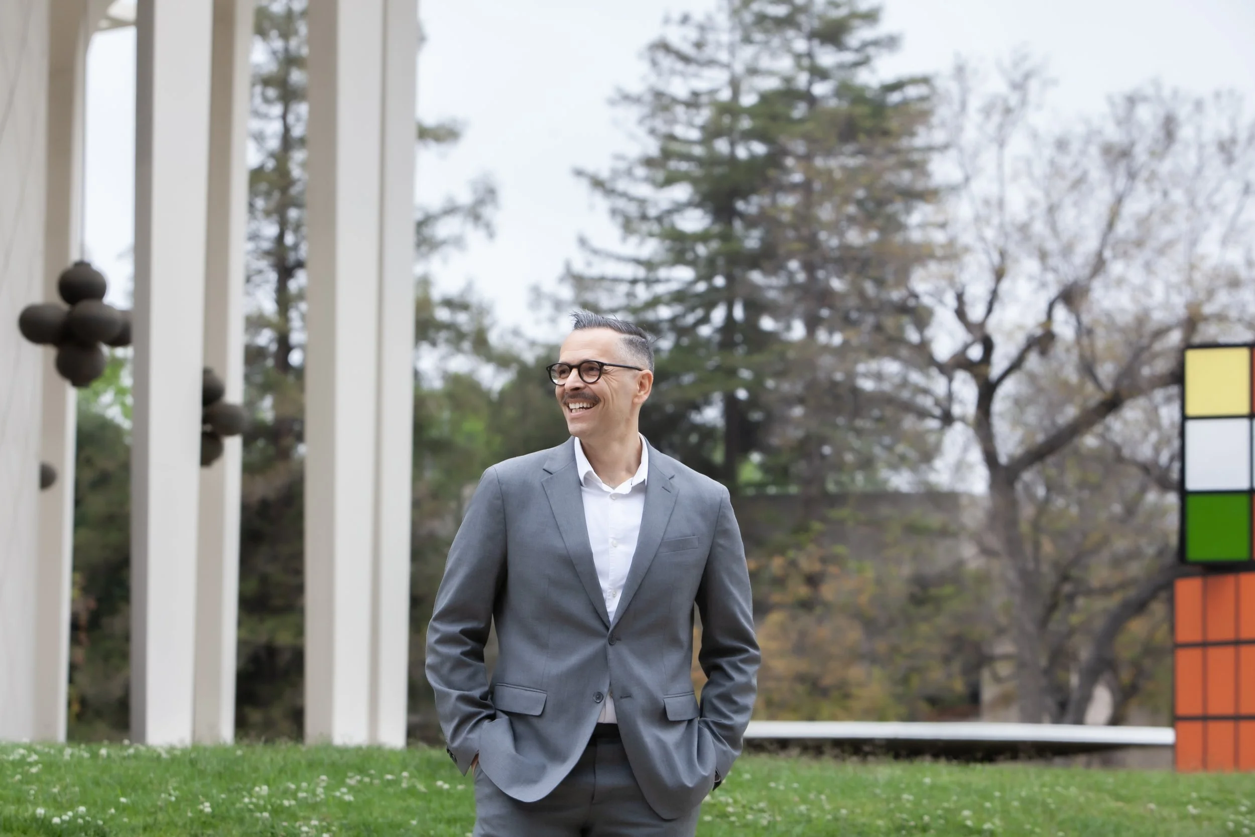 A man in a gray suit and white shirt smiling outdoors on a cloudy day, with trees in the background and a large colorful Rubik's Cube sculpture nearby. View fullsize