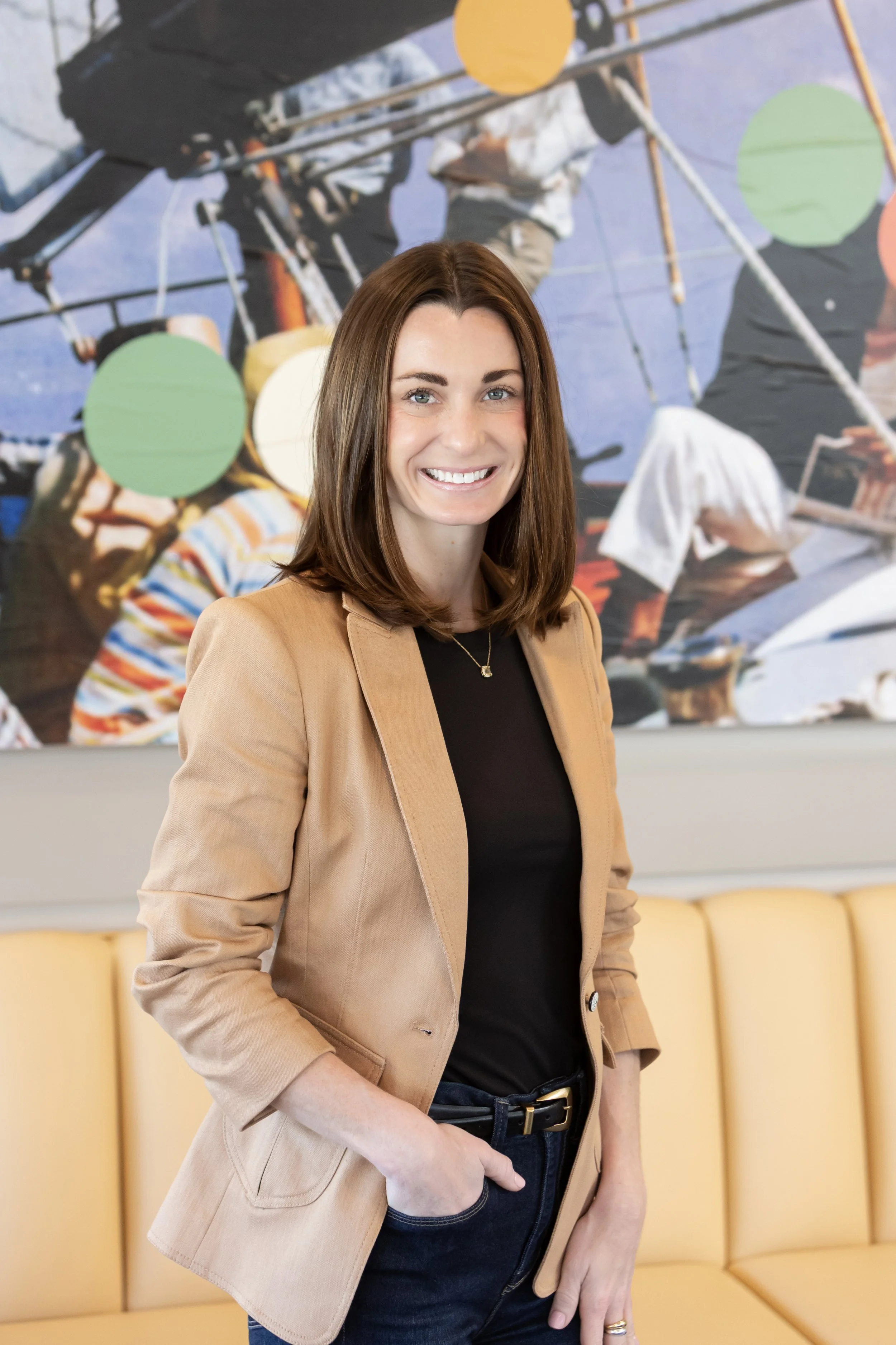 A smiling woman with shoulder-length brown hair, wearing a beige blazer over a black top, standing in front of a vibrant mural or photograph featuring people at sea on a boat or ship, with colorful lights or decorations hanging overhead.