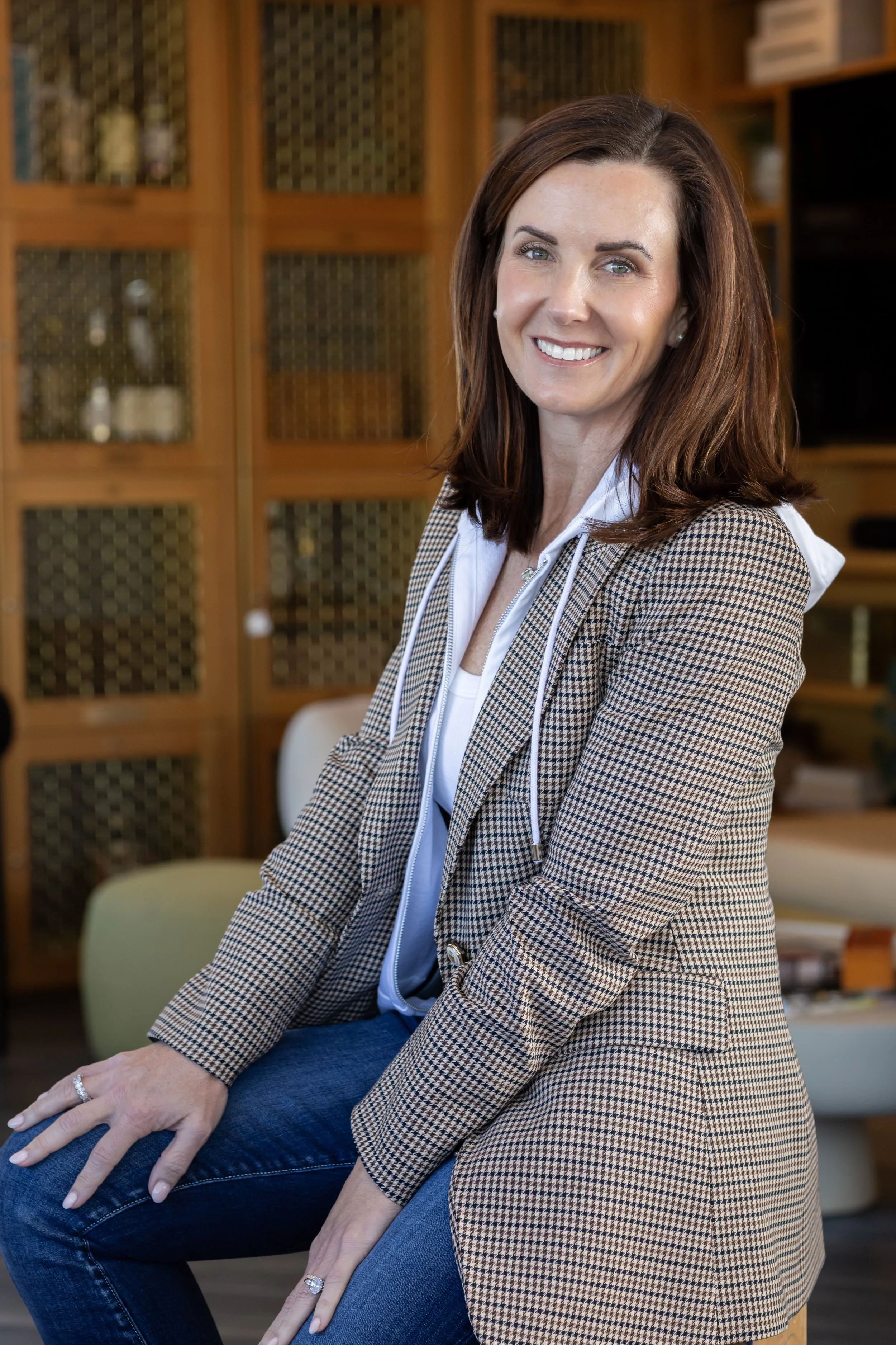 A woman with brown hair and a checkered blazer sitting indoors, smiling at the camera.