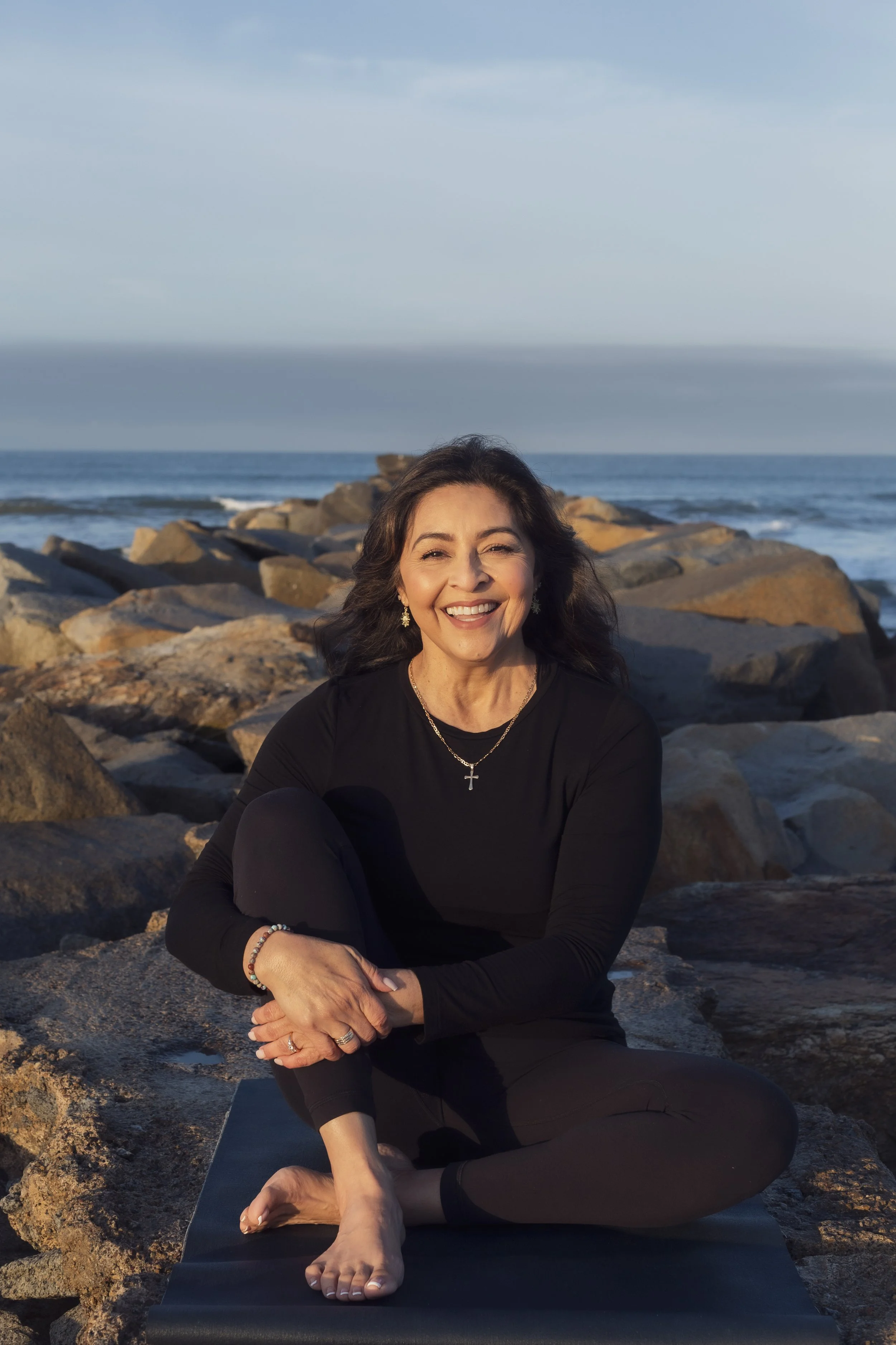 A woman practicing yoga on a mat on rocky shoreline, smiling, with ocean waves and a cloudy sky in the background.