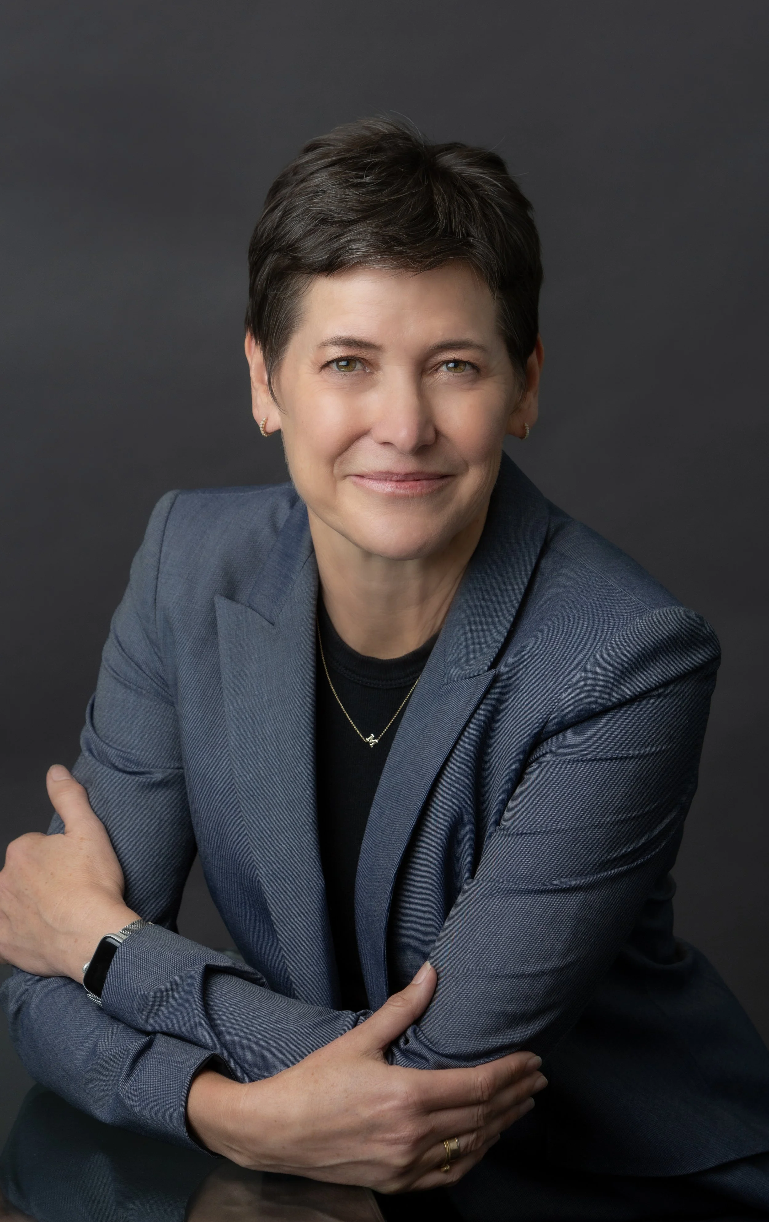 A professional woman with short dark hair, wearing a blue blazer over a black top, sitting with her arms crossed against a dark gray background.