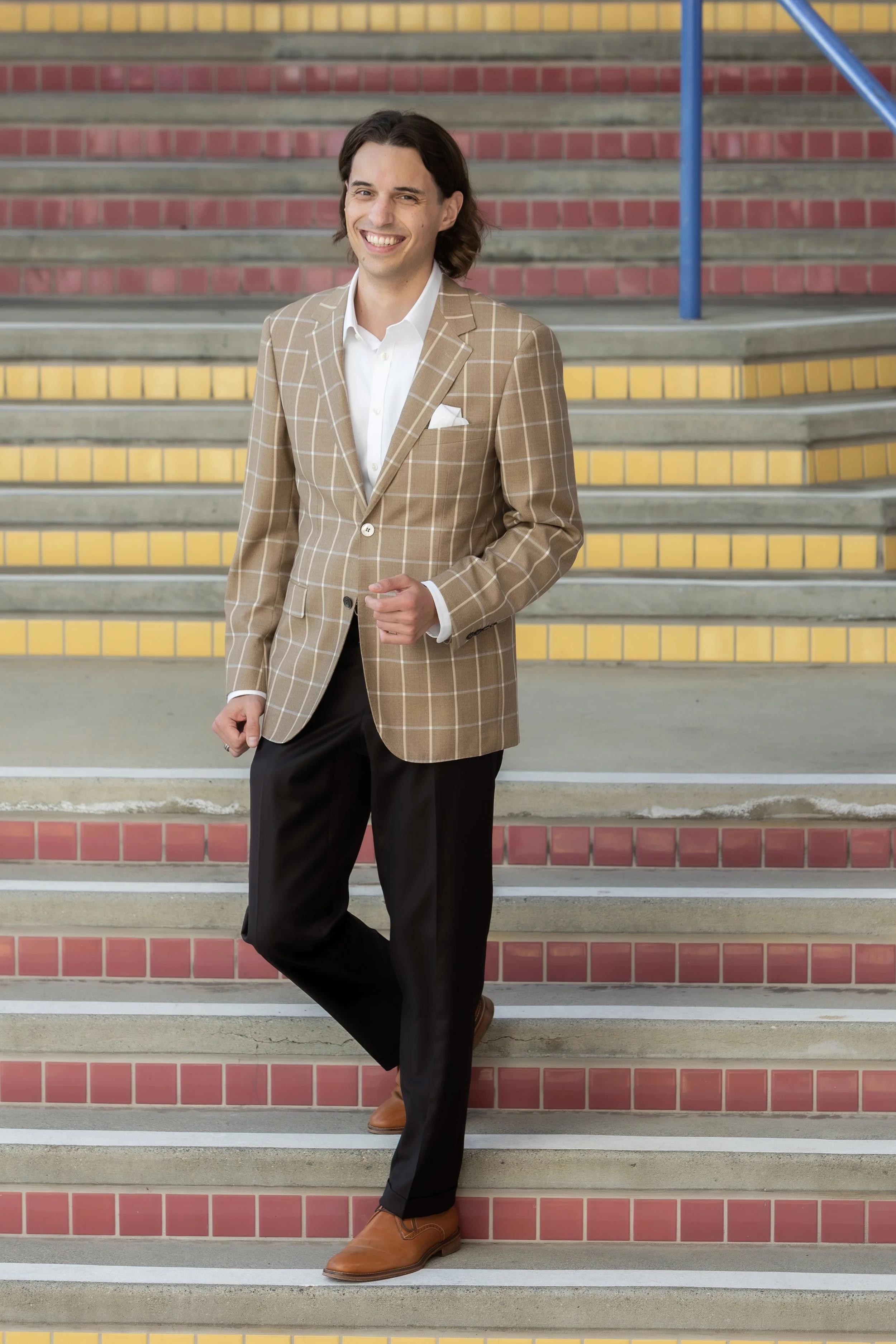 A man in a tan plaid blazer, white shirt, black pants, and brown shoes standing on colorful steps with a blue railing, smiling at the camera. View fullsize