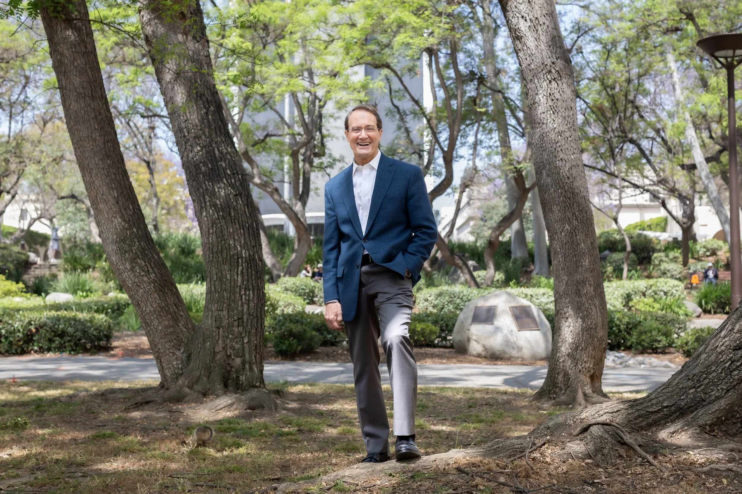 A man in a black suit and white shirt standing outdoors in front of a modern glass building with palm trees. View fullsize