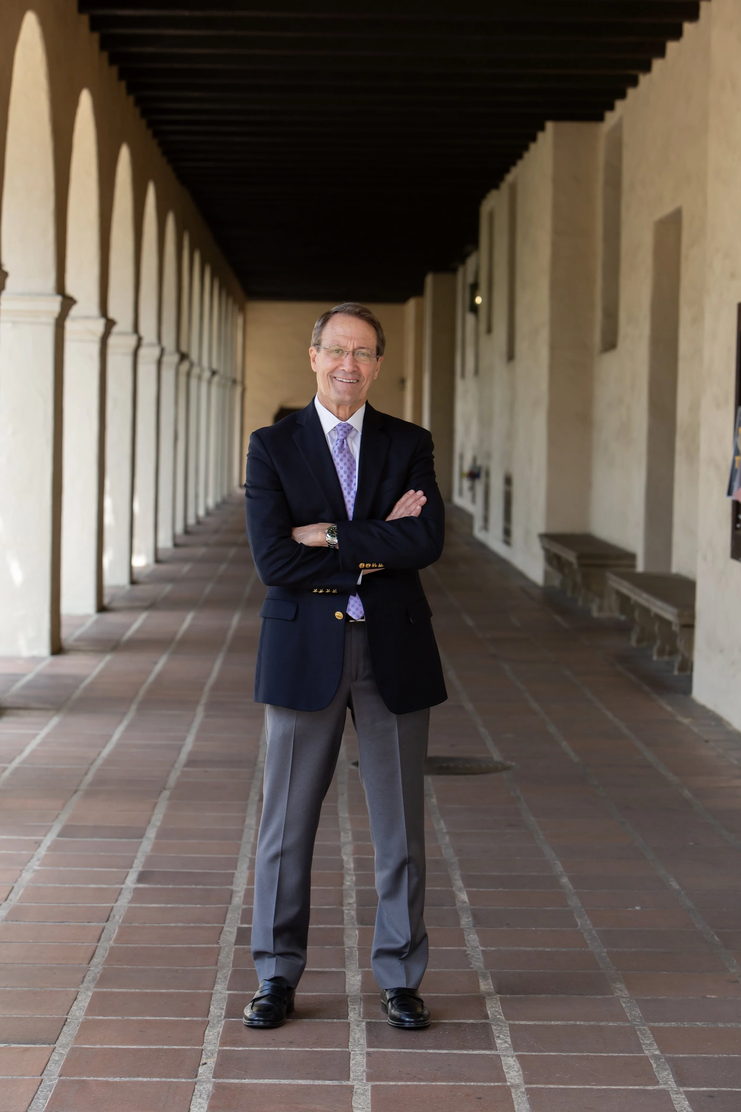 A man in a suit standing with arms crossed in a corridor with arches and benches. View fullsize