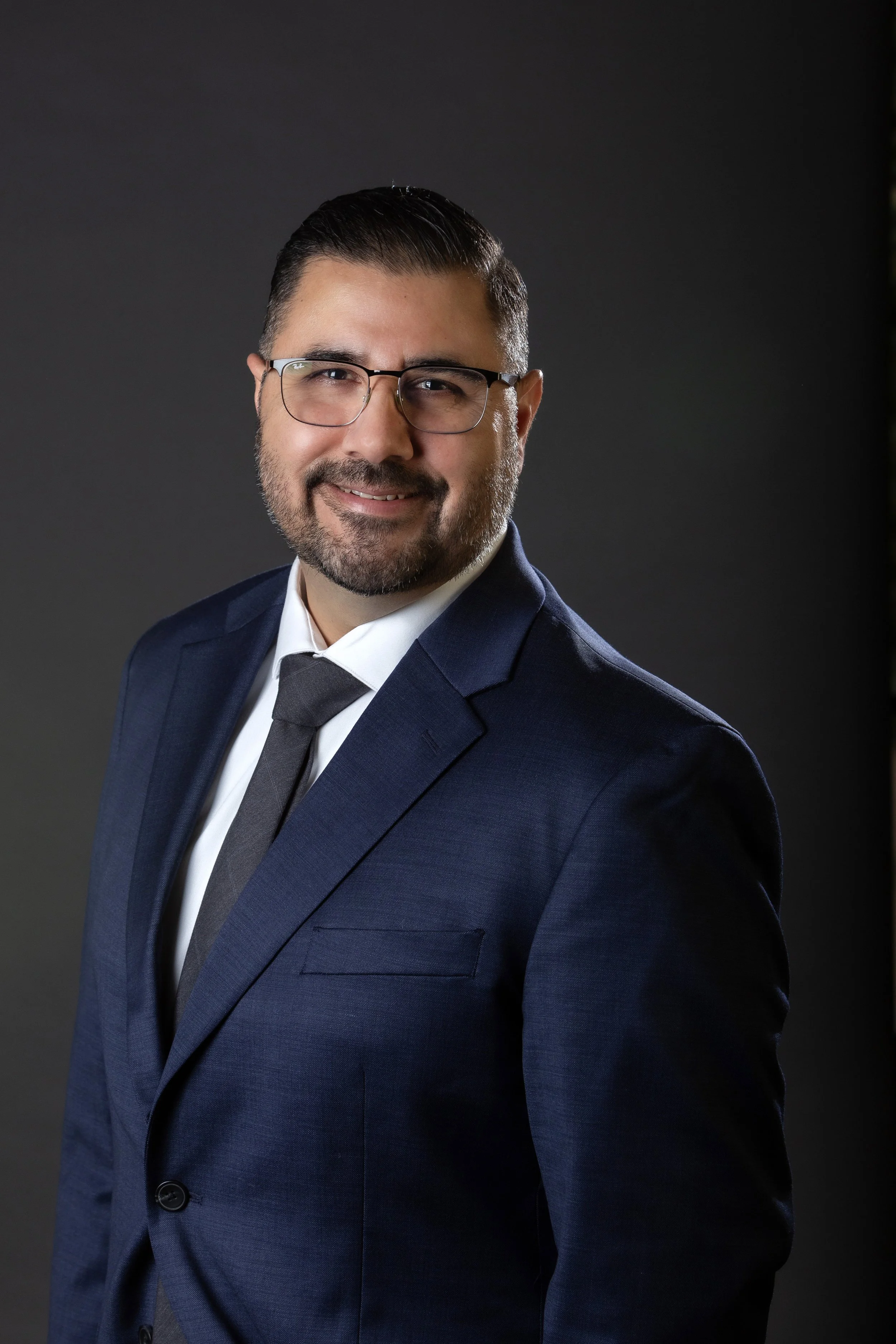 Professional headshot of a man in a dark blue suit, white shirt, and dark tie, wearing glasses, with dark hair and a beard, smiling against a dark background. View fullsize