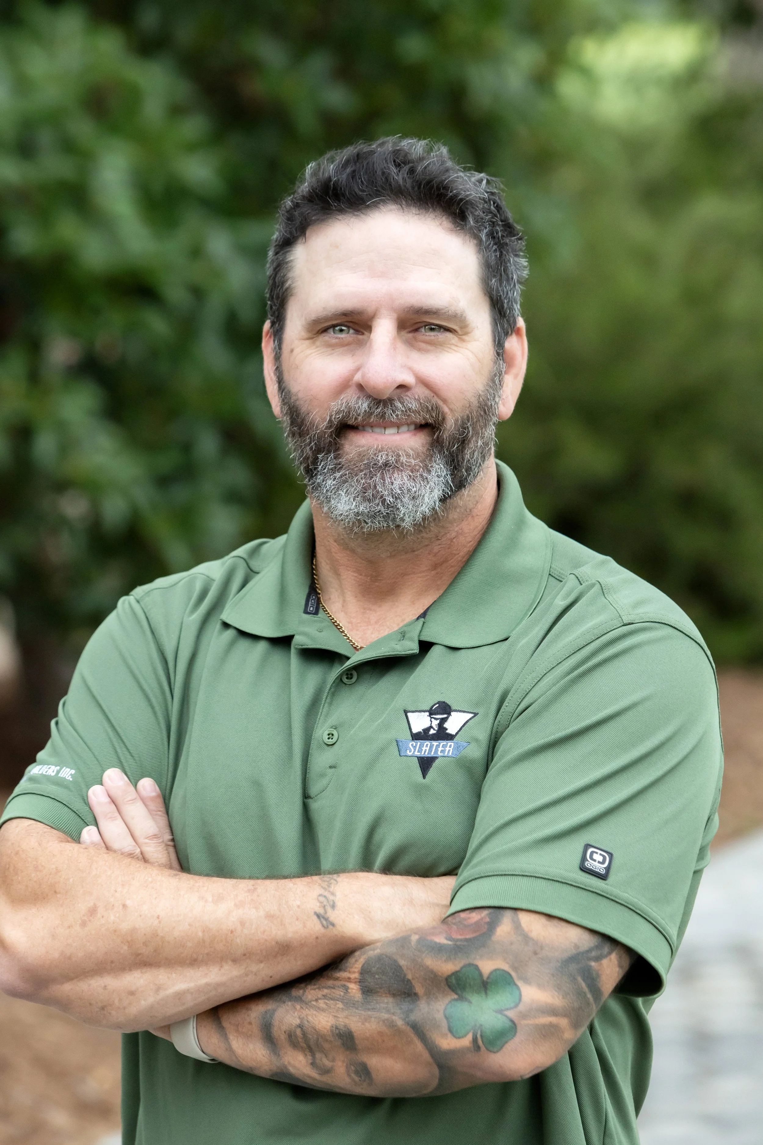 A man with a beard and tattoos wearing a green polo shirt, standing outdoors with his arms crossed, smiling at the camera.