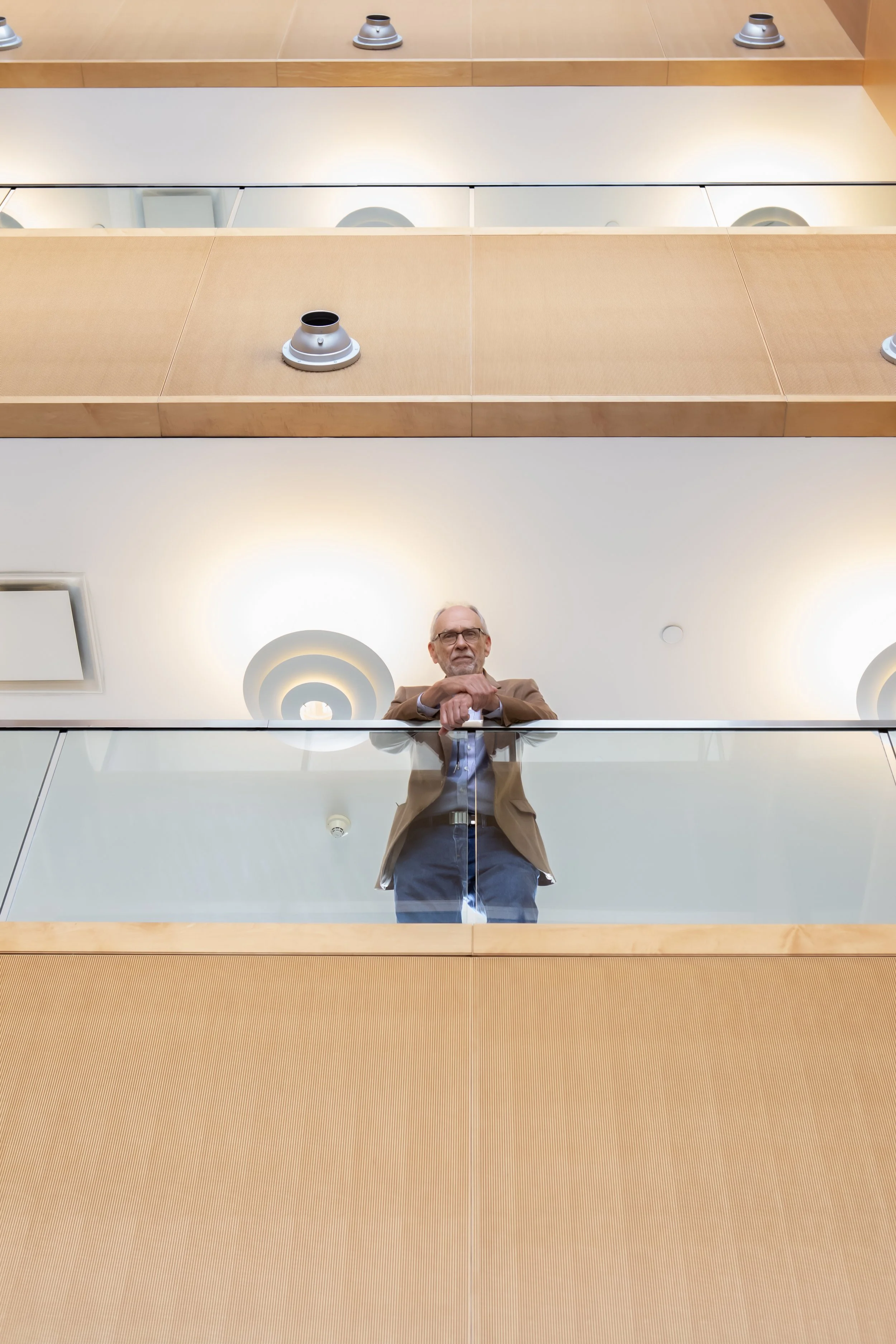 A man leaning on a glass balcony balustrade, viewed from below inside a modern building with beige walls and ceiling lights.