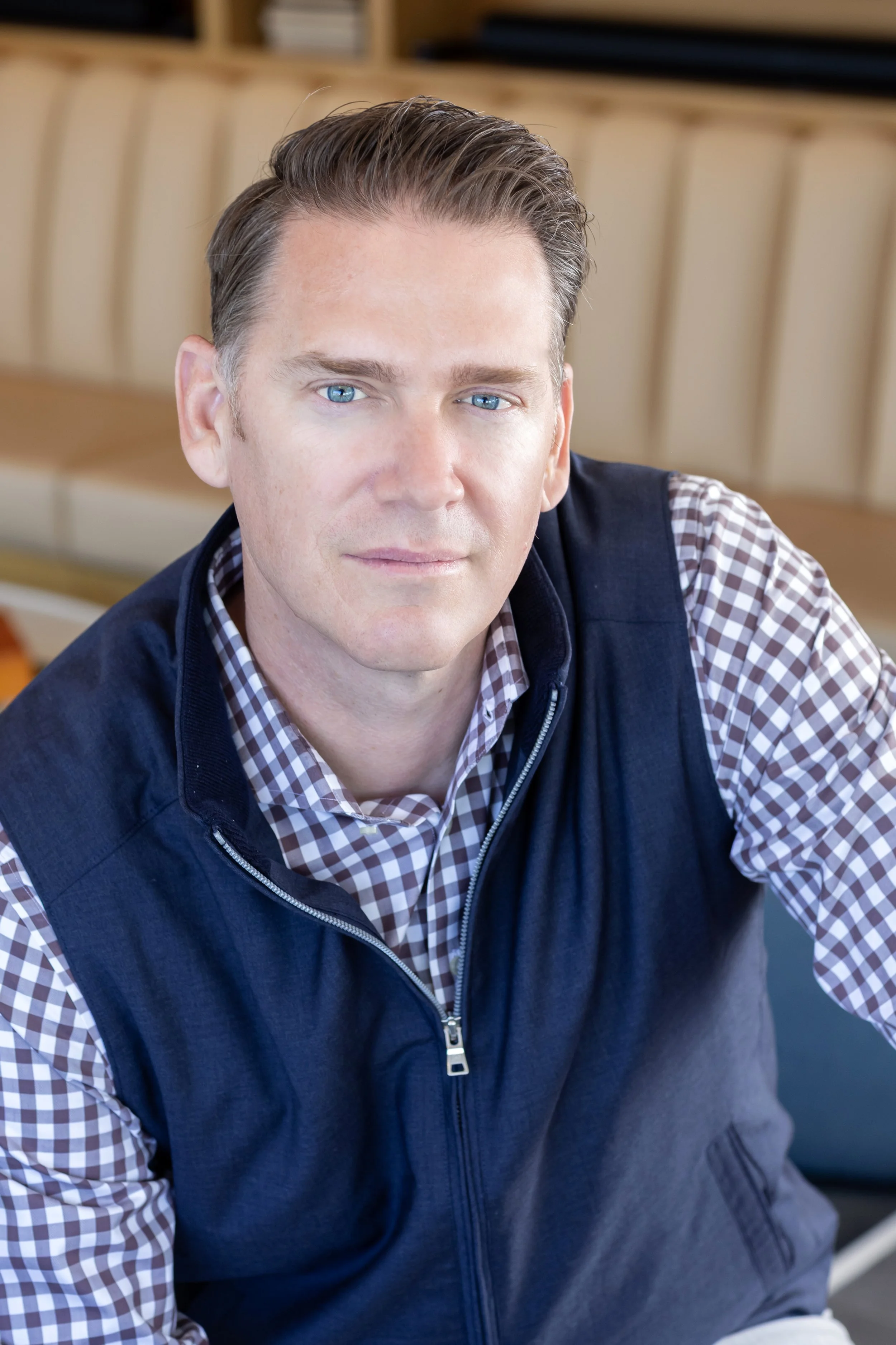 A man with blue eyes and light brown hair, wearing a checkered shirt and a dark vest, sitting indoors in front of a light-colored wooden surface. View fullsize