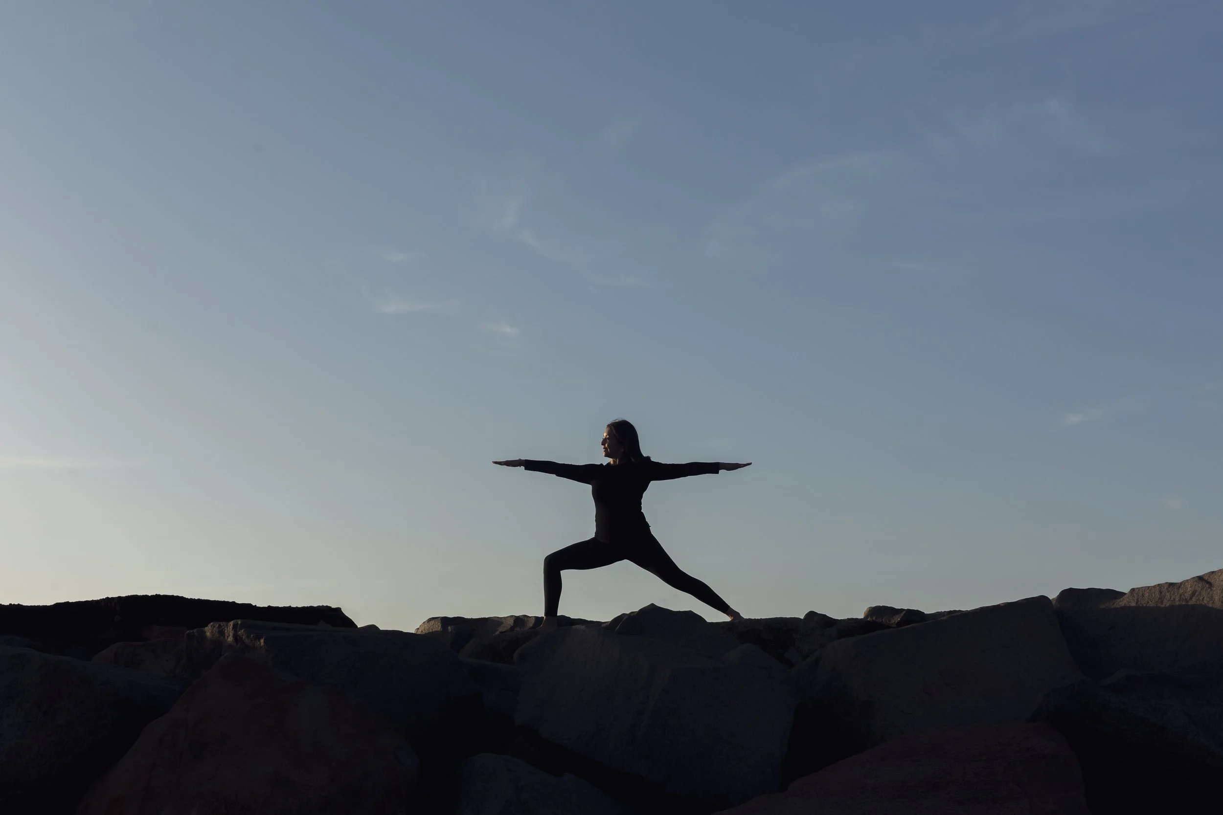 A woman practicing yoga outdoors on rocks, performing a Warrior pose at sunset or sunrise with a clear sky.
